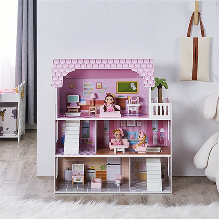 See puidust roosa kleebisega nukumaja koosneb tavaliselt mitmest ruumist, sealhulgas magamistoast, elutoast, köögist, vannitoast ja nii edasi.
